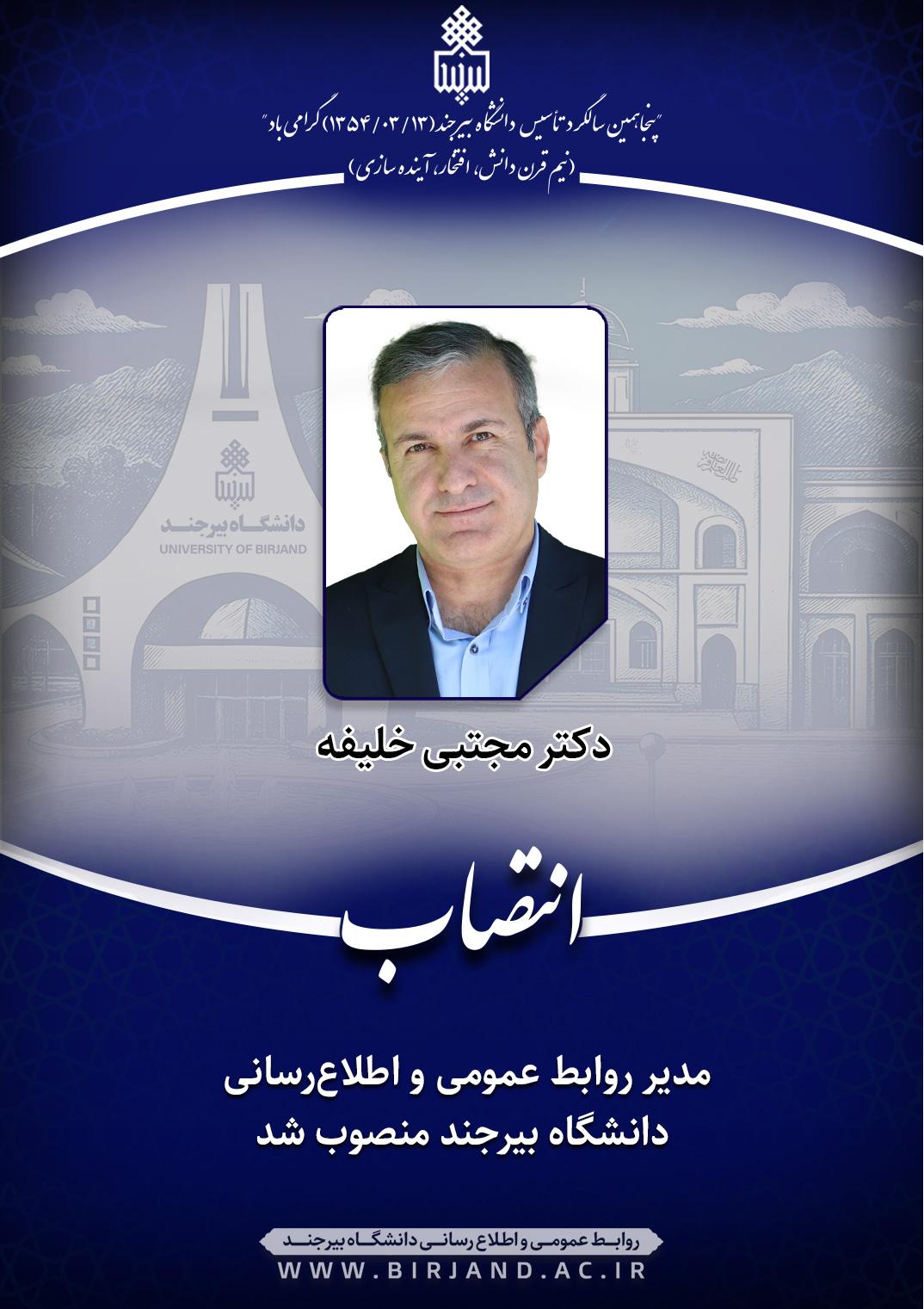 طی ابلاغی از سوی دکتر احمد خامسان، سرپرست دانشگاه بیرجند، دکتر مجتبی خلیفه، عضو هیأت علمی گروه آموزشی تاریخ، به مدت دو سال با حفظ سمت‌های آموزشی و پژوهشی، به عنوان مدیر روابط عمومی و اطلاع‌رسانی دانشگاه منصوب شد. مراسم تودیع و معارفه مدیر روابط عمومی روز شنبه ۲۹ شهریور ۱۴۰۴ در سالن جلسات حوزه ریاست برگزار شد.