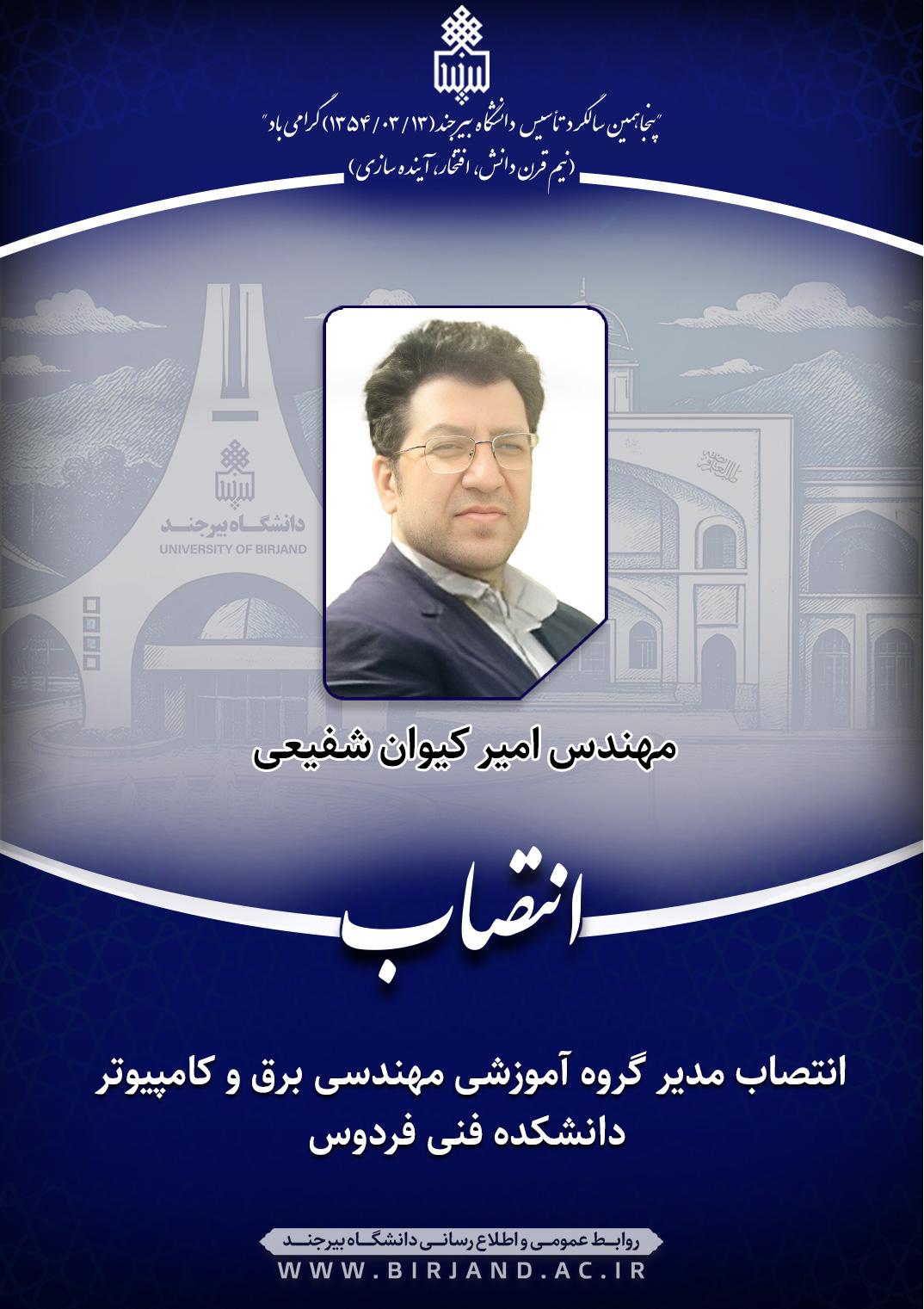 دکتر احمد خامسان، سرپرست دانشگاه بیرجند، براساس ابلاغی، مهندس امیر کیوان شفیعی، عضو هیأت علمی گروه آموزشی مهندسی کامپیوتر دانشکده فنی فردوس را به سمت مدیر گروه آموزشی مهندسی برق و کامپیوتر این دانشکده به مدت دو سال منصوب کرد.