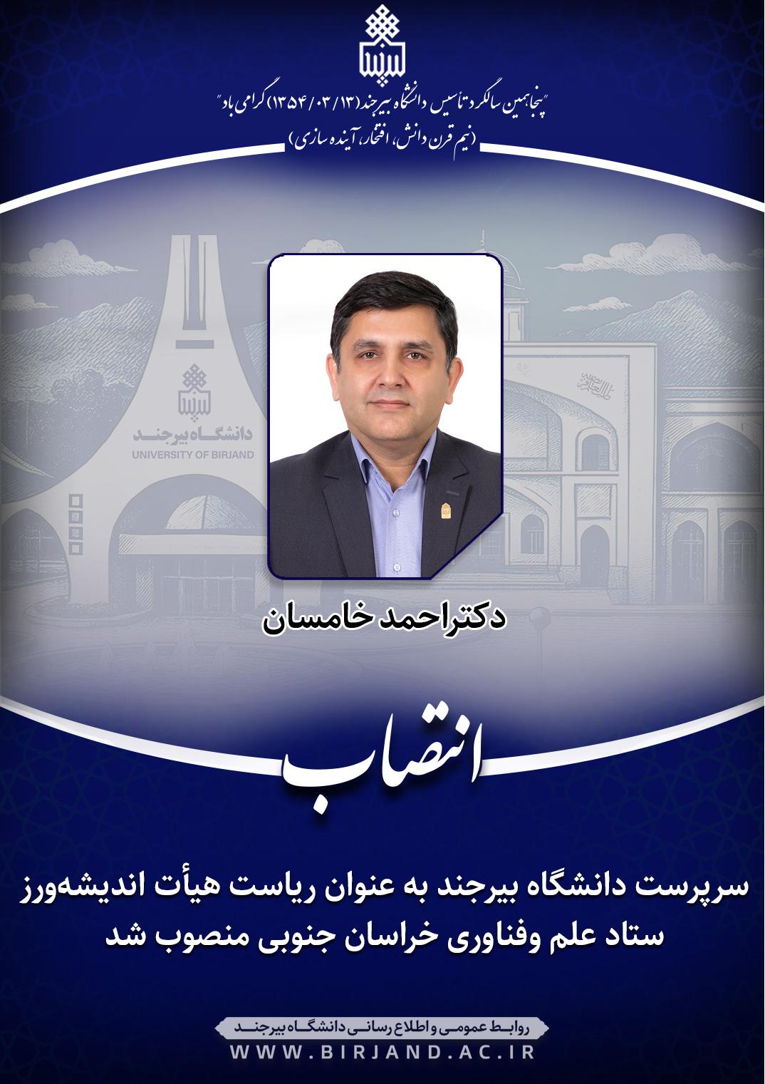 به‌گزارش روابط عمومی و اطلاع‌رسانی دانشگاه بیرجند، در حکمی از سوی حجت الاسلام والمسلمین دکتر عبدالحسین خسروپناه، دبیر شورای عالی انقلاب فرهنگی، دکتر احمد خامسان، سرپرست دانشگاه بیرجند، به سمت ریاست هیأت اندیشه ورز در ستاد علم و فناوری در استان خراسان جنوبی منصوب شد.