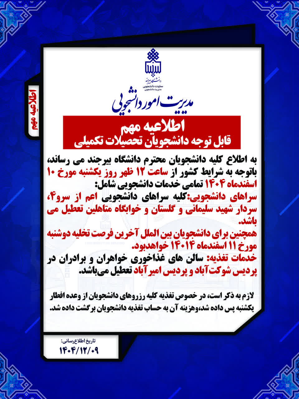 ضمنا به اطلاع کلیه دانشجویان محترم تحصیلات تکمیلی دانشگاه بیرجند می‌رساند، باتوجه به شرایط کشور از ساعت 12 ظهر روز یکشنبه مورخ 10 اسفندماه 1404 تمامی خدمات دانشجویی شامل