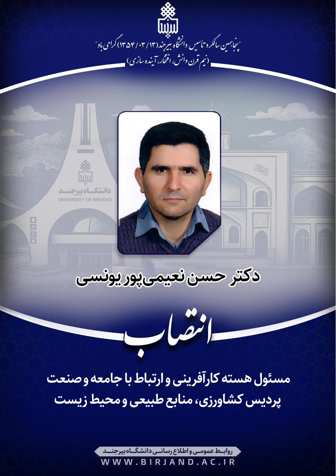 طی ابلاغی، دکتر احمد خامسان، سرپرست دانشگاه بیرجند، دکتر حسین نعیمی‌پور یونسی، عضو هیأت علمی گروه آموزشی علوم دامی را به مدت دو سال به سمت مسئول هسته کارآفرینی و ارتباط با جامعه و صنعت پردیس کشاورزی، منابع طبیعی و محیط زیست منصوب کرد.