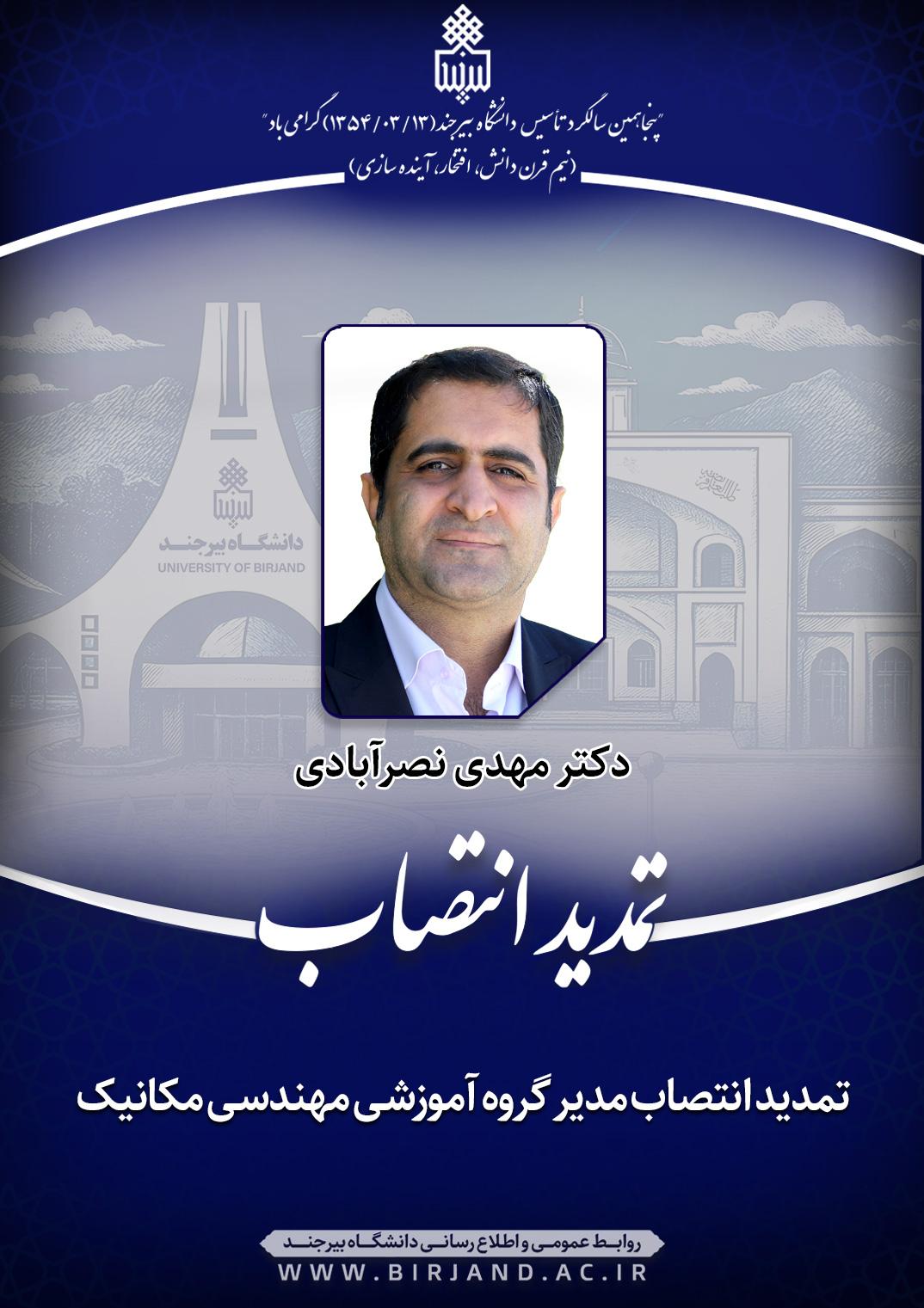 به گزارش روابط عمومی و اطلاع‌رسانی دانشگاه بیرجند، در ابلاغ صادره از سوی دکتر خامسان، سرپرست دانشگاه به دکتر نصرآبادی، مدیر گروه آموزشی مهندسی مکانیک آمده است؛ نظر به مراتب تعهد، تجارب و شایستگی‌های علمی و اجرایی جناب‌عالی و با تشکر از اقدامات و تلاش‌های مستمر، مثمرثمر و ارزشمند شما در دو سال اخیر، به پیشنهاد رئیس محترم پردیس مهندسی بـه موجب این ابلاغ و بـا حفـظ سمت آموزشی و پژوهشی، با تمدید انتصاب شما در سمت «مدیر گروه آموزشی مهندسی مکانیک» پردیس مهندسی به مدت دو سال موافقت می‌شود. انتظار دارد علاوه بر اجرای وظایف مدیران گروه‌های آموزشی مندرج در آئین‌نامه‌ها و دستورالعمل‌های وزارتی و داخلی دانشگاه، به آیین‌نامۀ جامع مدیریت دانشگاه‌ها و مؤسسات آموزش عالی، پژوهشـی و فناوری، رئوس انتظارات دانشگاه،( براساس شرح وظایف سازمانی، مصوبات هیآت نظارت، ارزیابی و تضمین کیفیت و سند چشم‌انداز) دستورالعمل میزان و نحوه حضور و  فعالیت اعضای هیأت علمی دانشگاه در طرح‌های تمام وقت عادی و ویژه توجه شود.